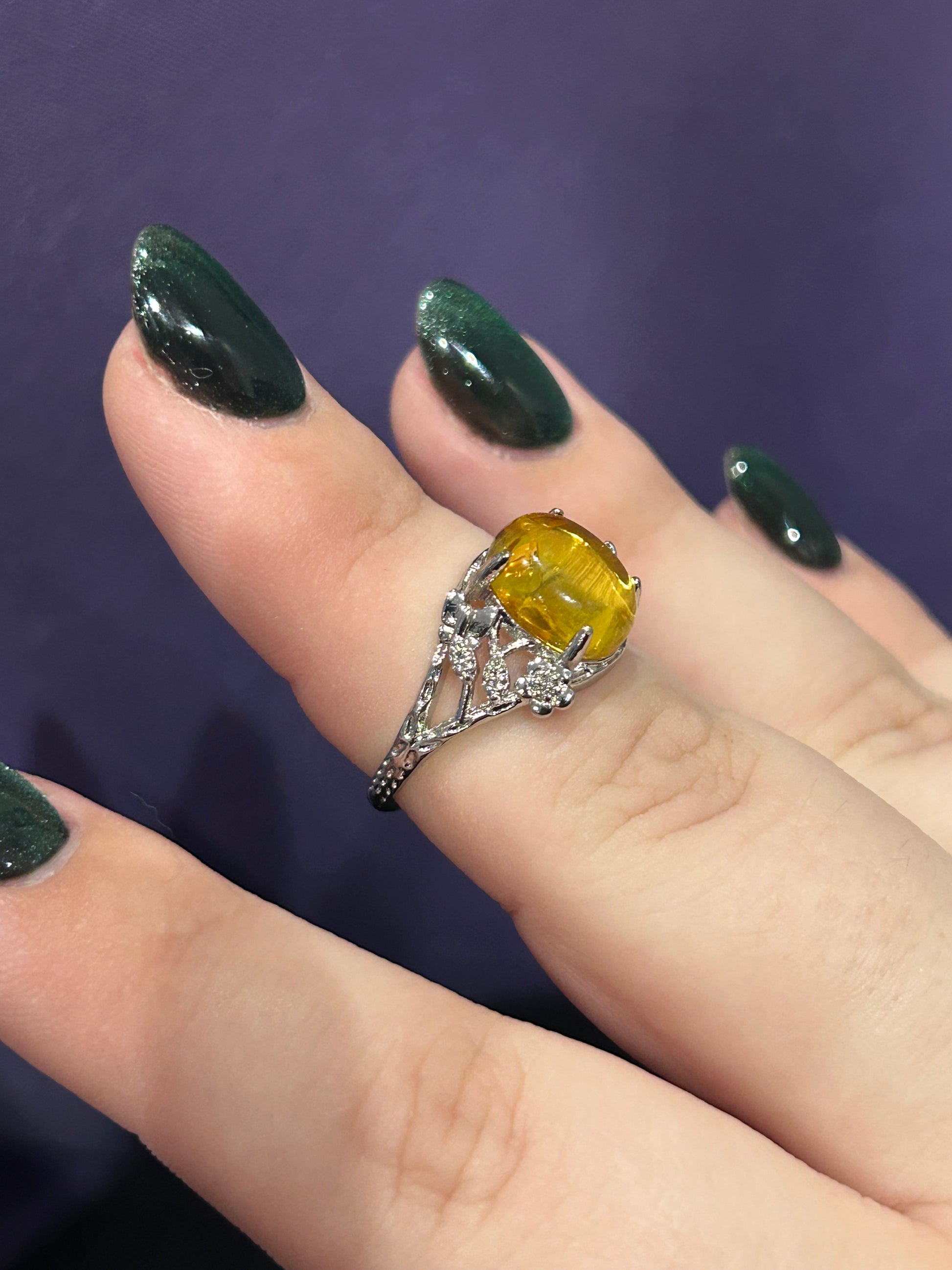 Silver plated adjustable ring setting with a gorgeous amber cabochon, as this is silver plated avoid water