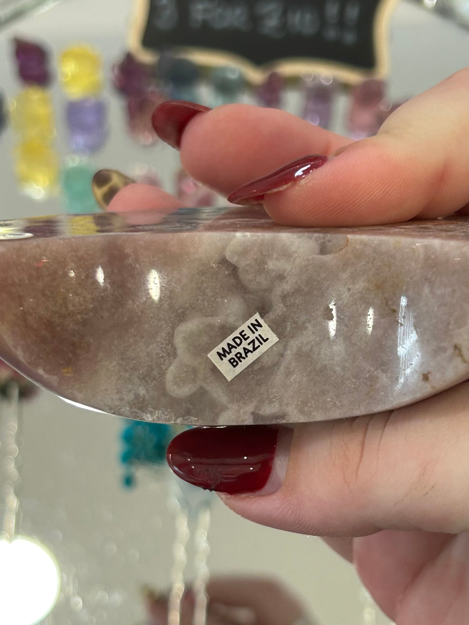 High quality pink amethyst moon carving from Brazil with stunning quartzy rainbow areas