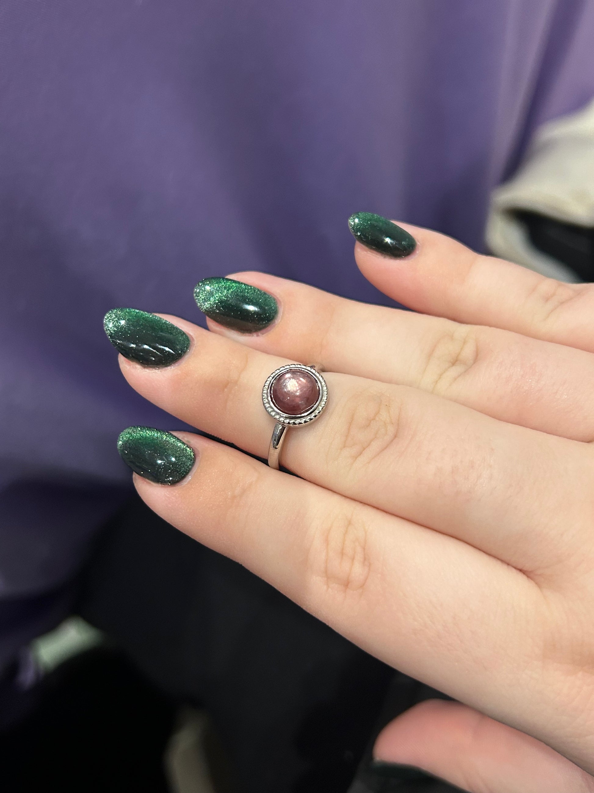 Silver plated adjustable ring setting with a gorgeous gem lepidolite cabochon, as this is silver plated avoid water