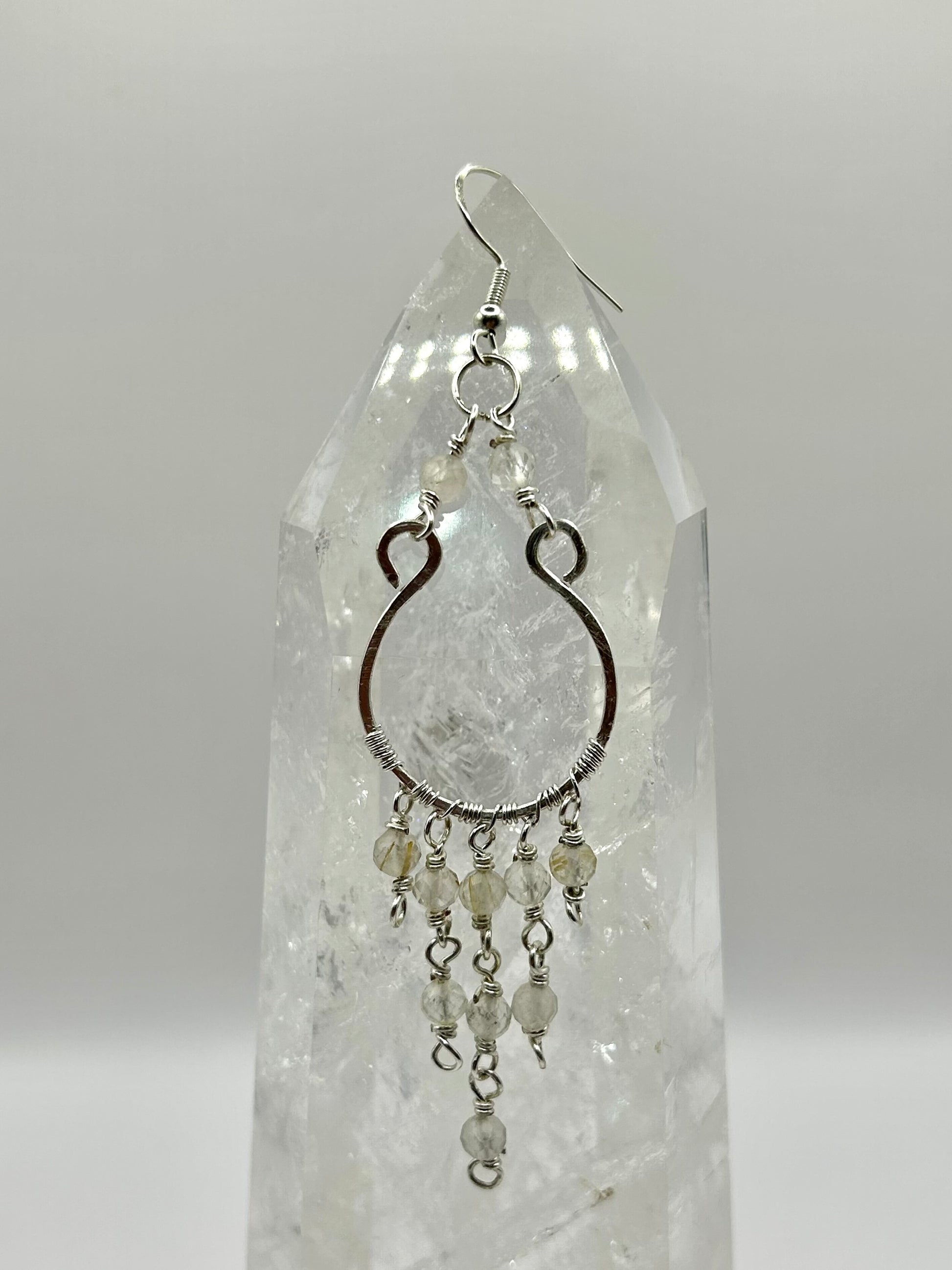 Handmade wire framed earrings with silver plated copper wire, golden rutile accents to create an elegant look, on 925 sterling silver hooks. Not available in clip ons.