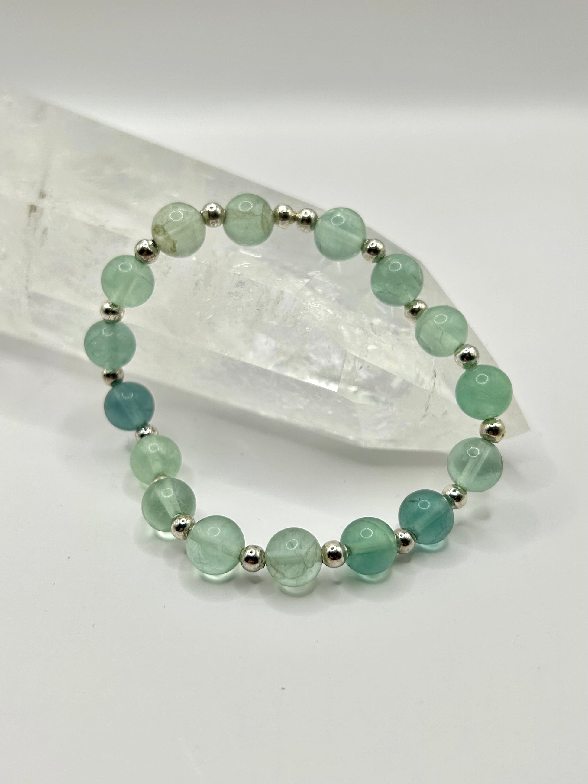 High grade fluorite crystal beads with rainbows, with silver plated spacer beads. Handmade with elastic. Made to 7 inches.