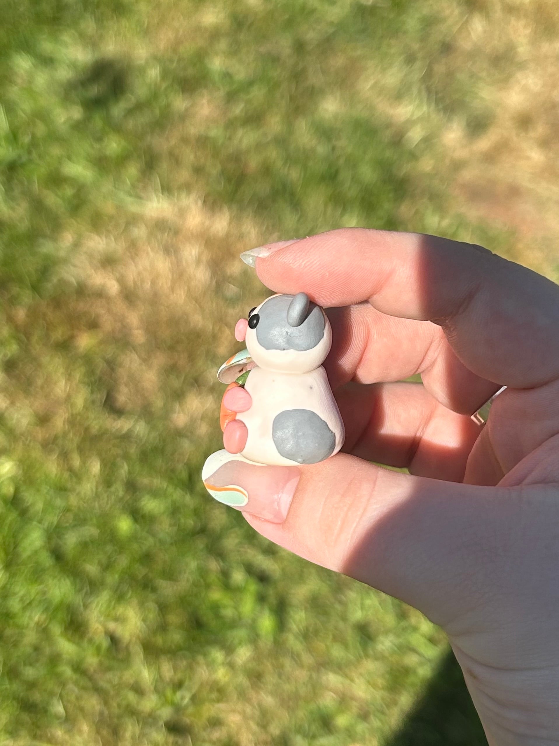 Handmade polymer clay sculpture holding a carrot. Pocket sized so easy to carry around with you. Sealed with a UV resin to help keep the sculpture protected.