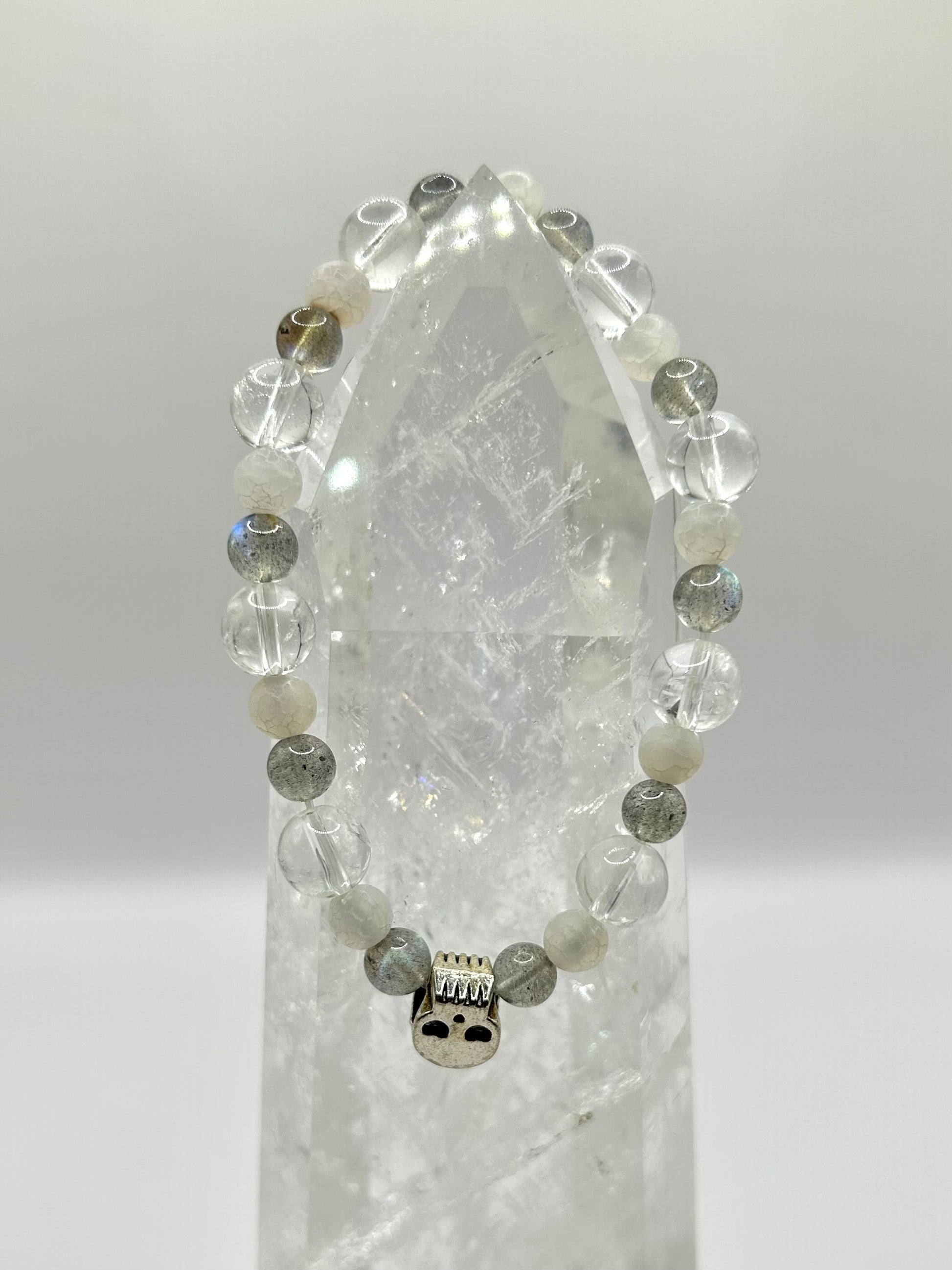 Stunning high quality labradorite, clear quartz and white dragons vein agate beads hand threaded by me on clear elastic, made to 7 inches.