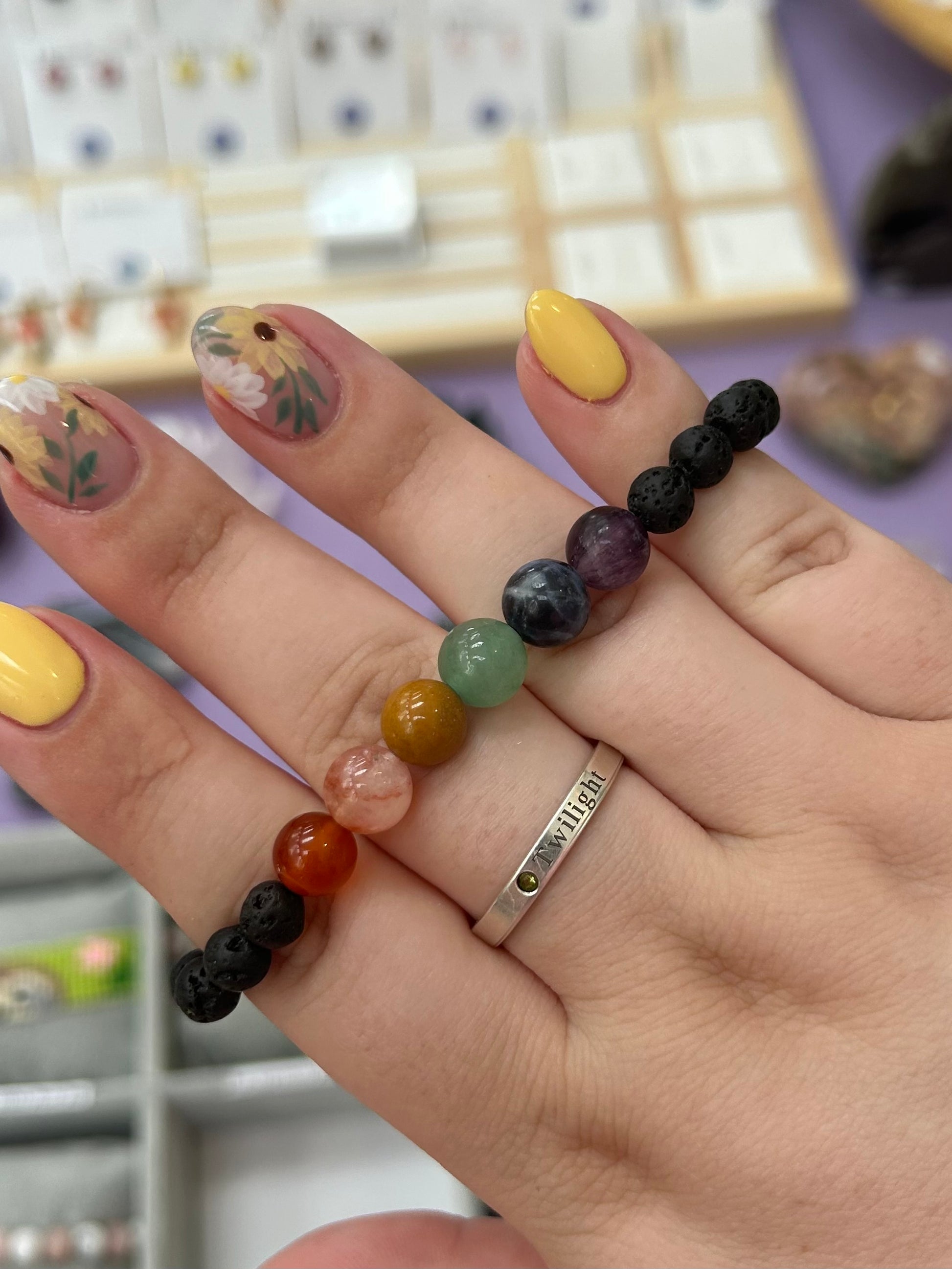 Handmade on clear elastic to 7 inches, 7 crystals are carnelian, fire quartz, Mookaite, green aventurine, sodalite and amethyst