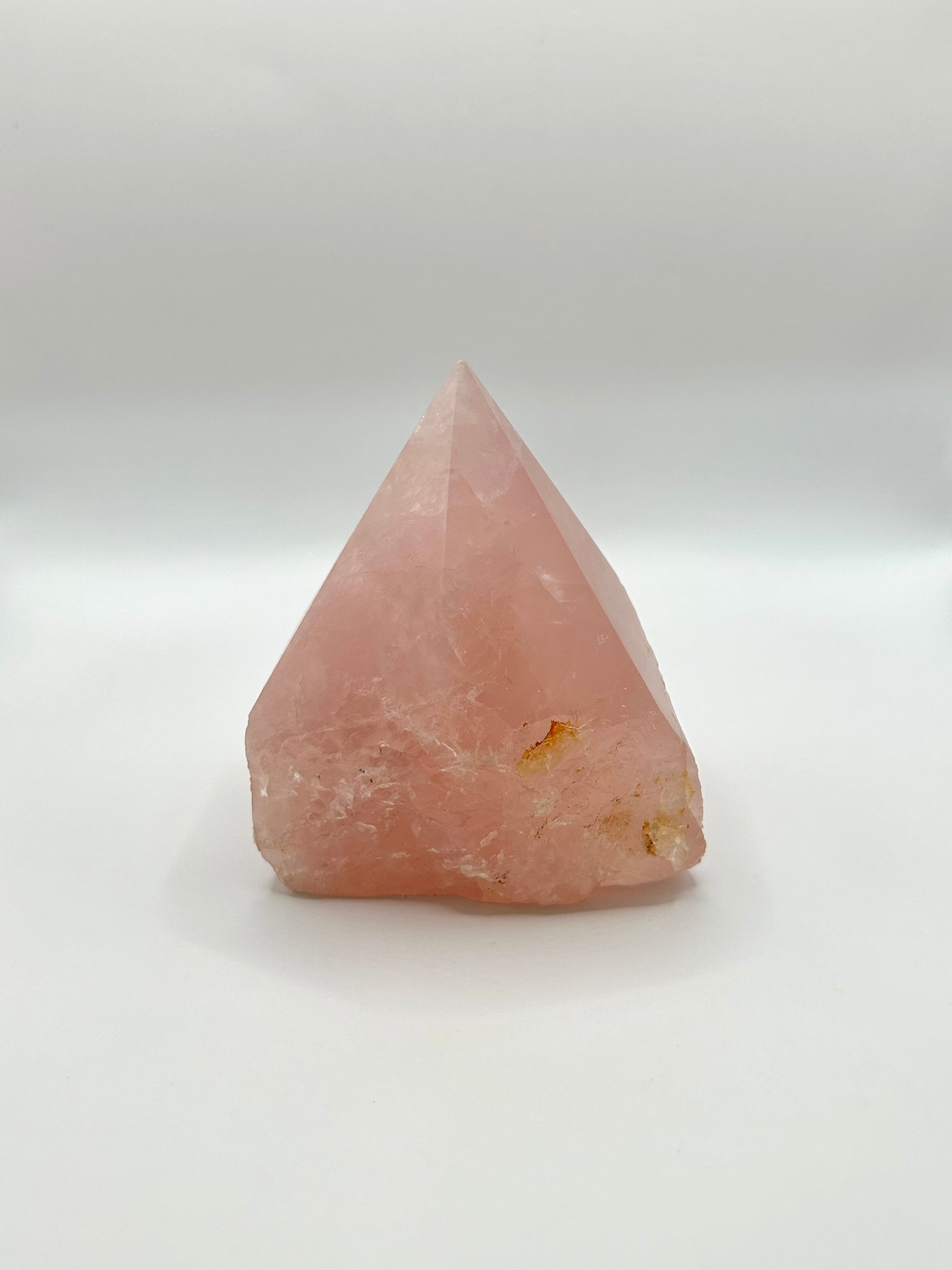 Half polished, half raw rose quartz cut base with golden healer parts! Lovely pink colour, great for beginners or avid collectors!