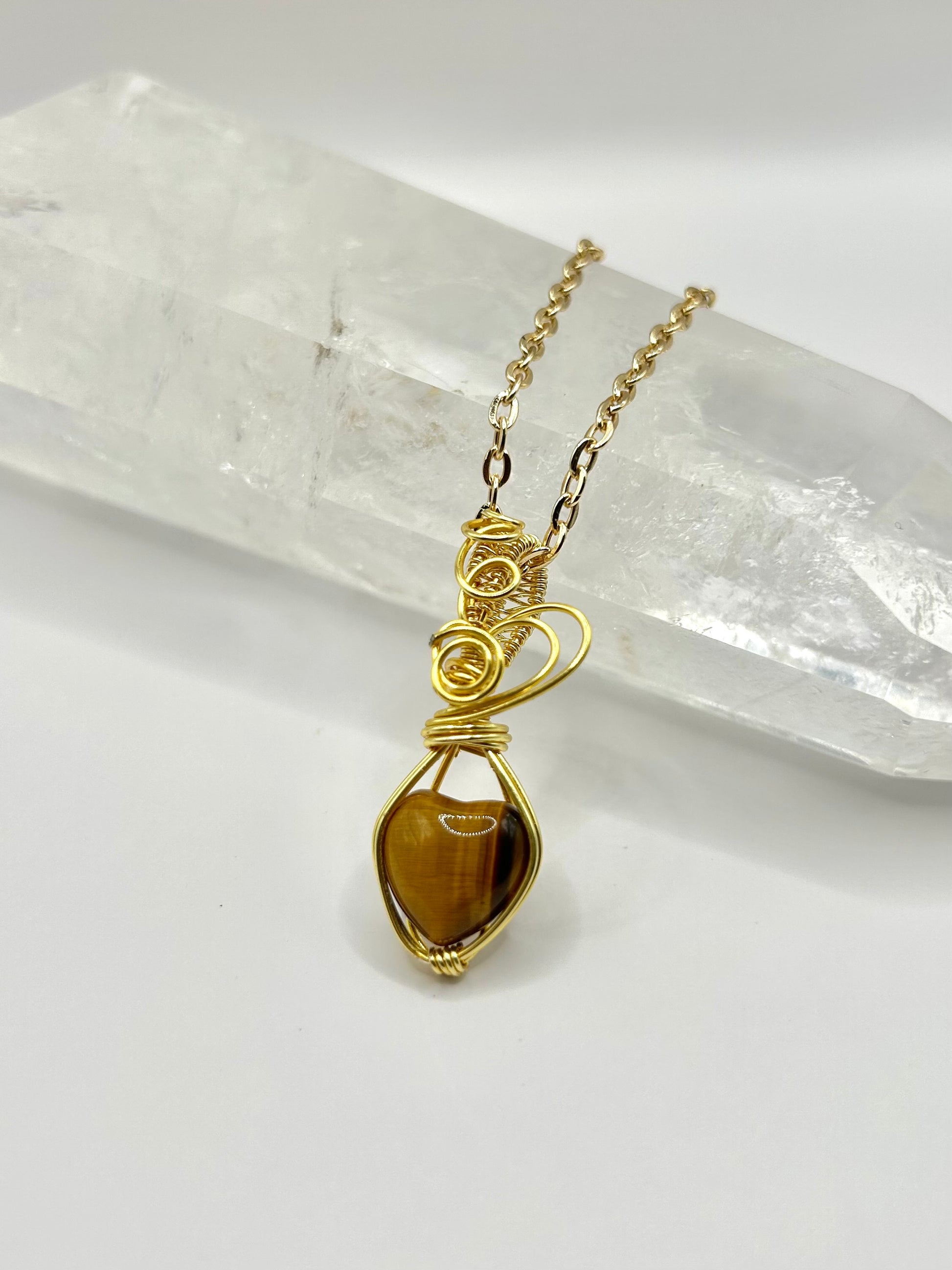 Hand wrapped tigers eye heart cab in gold plated copper wire, available on a 24k gold plated chain or a black cord